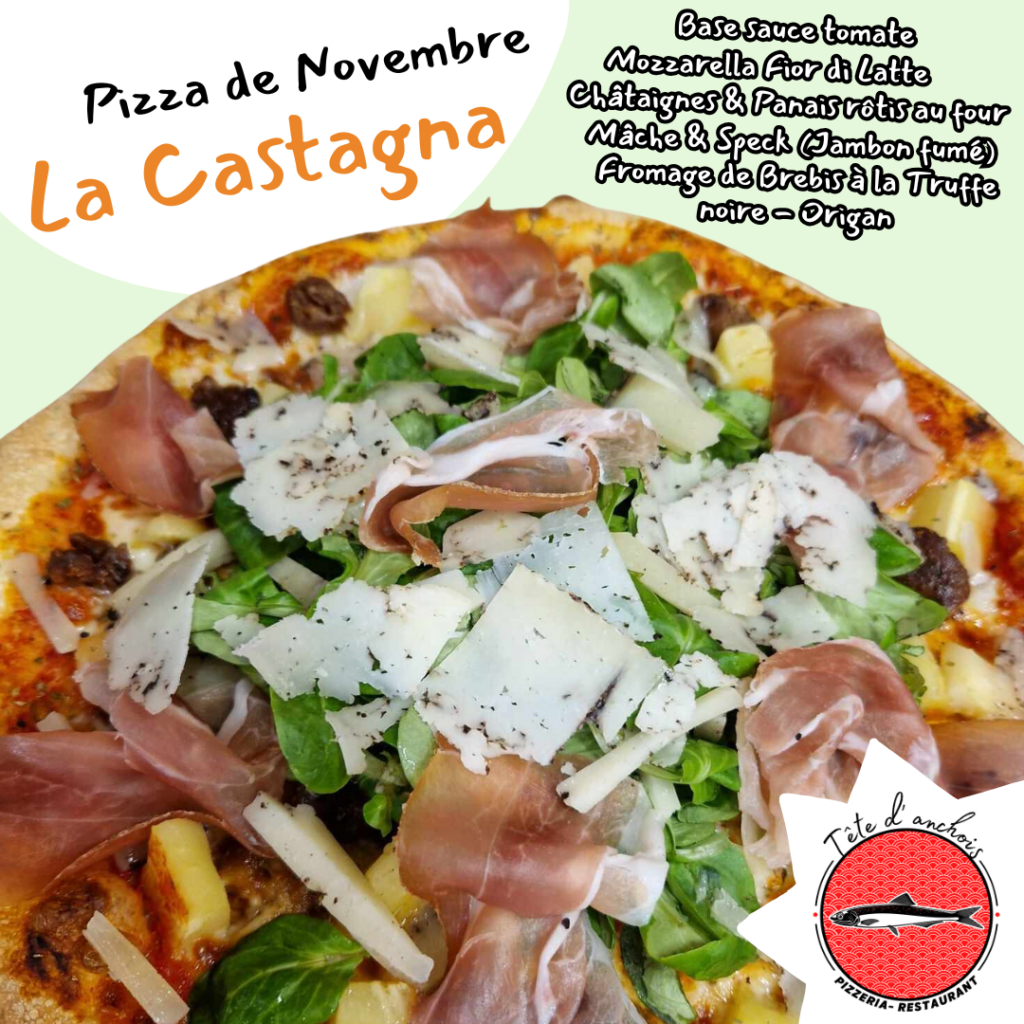 🟤 Notre pâte à pizza faite maison et étalée à la main 🍅 Base sauce tomate 🧀 Mozzarella Fior Di Latte 🥕 Panais rôtis au four 🌰 Châtaignes 🍃 Mâche 🥓 Speck (jambon de montagne italien fumé) 🐑 Fromage de brebis à la truffe noire 🌿 Origan