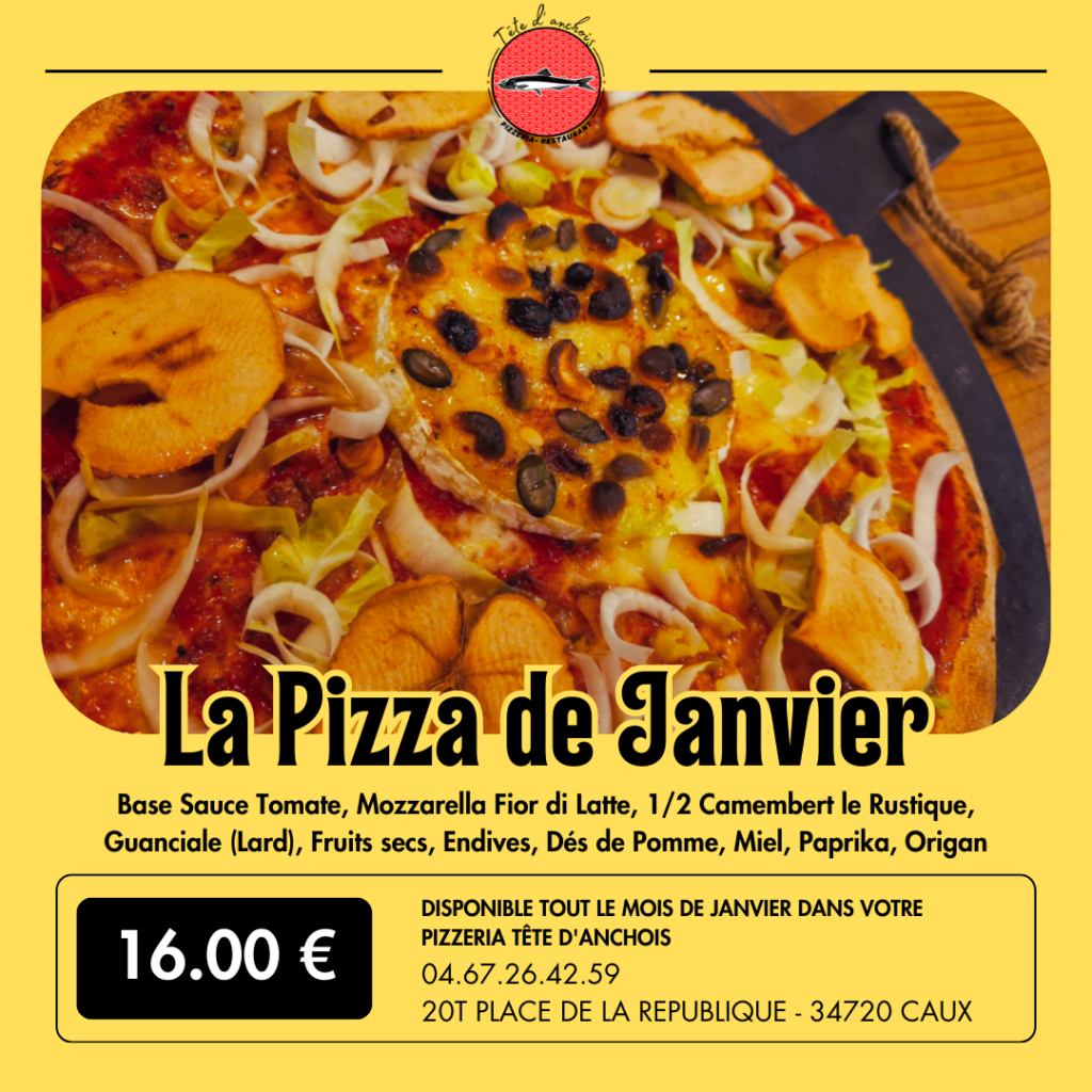 🟤 Notre pâte à pizza faite maison et étalée à la main 🍅 Base sauce tomate 🧀 Mozzarella Fior Di Latte 🧀 1/2 Camembert le Rustique 🥓 Guanciale (lard) 🌰 Fruits secs 🥬 Endives 🍏 Dés de Pomme 🍯 Miel 🧂 Paprika 🌿 Origan