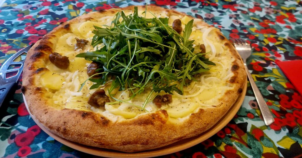 Roquette, Pommes de Terre au Pesto, Anchois marinés à l’ail, Oignons, Tomates cerises, Câpres, Olives noires, Parmesan, Huile d’Olive, Crème de Balsamique